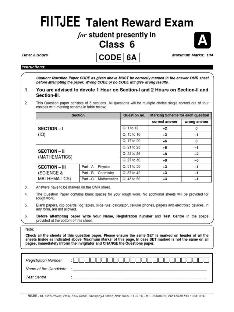 3 Hours Maximum Marks. 3 Hours Maximum Marks. FIITJEE Talent Reward Exam for student presently in Class 6 PDF Free Download Download Study Material for preparation of AIEEE for free.